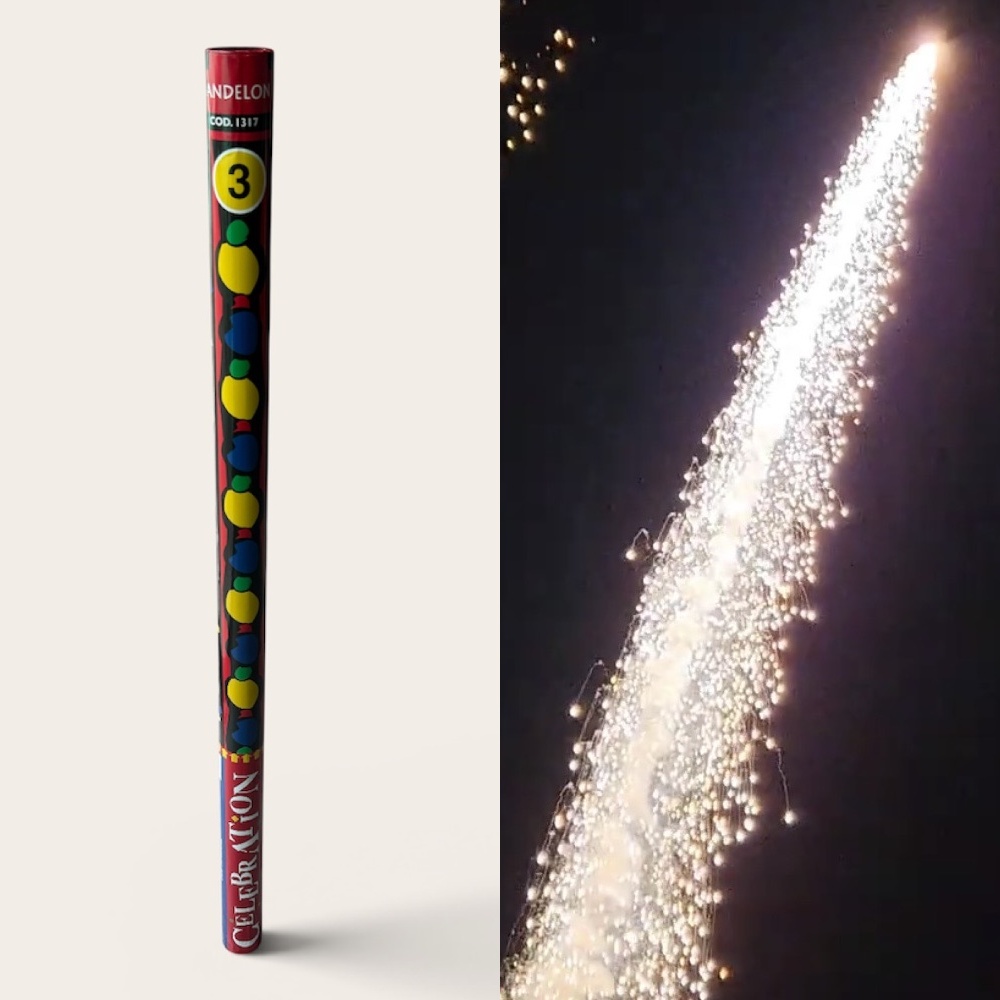 Cañón de 1,25″ pulgadas que lanza 8 bombas de trazante y cracker (luces doradas y chisporroteo).