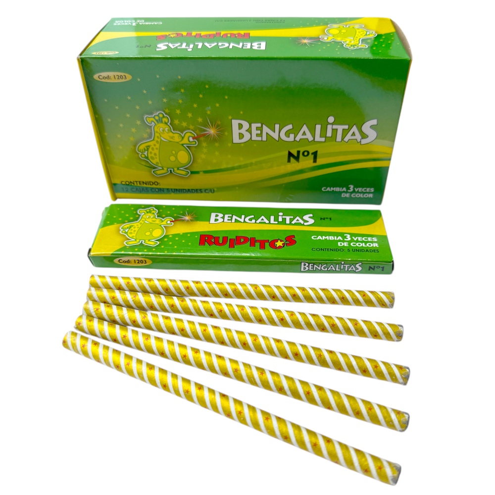 Varilla con haz de luz, fuego de color y chispas finales. Artículo infantil premium que se sostiene con la mano (similar a las estrellitas en cuanto al uso) de 8mm de diámetro, 15cm de largo, que emite dos cambios de color y chispas doradas.