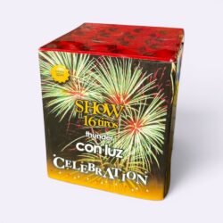 Torta que produce 36 Fuegos Artificiales de efecto PET FRIENDLY (silencioso): Tallo rojo, cascada roja y perlas azules. Tallo amarillo, cascada azul y verde. Tallo verde, cascada de strobe rojo y verde. Duración: 45 seg.